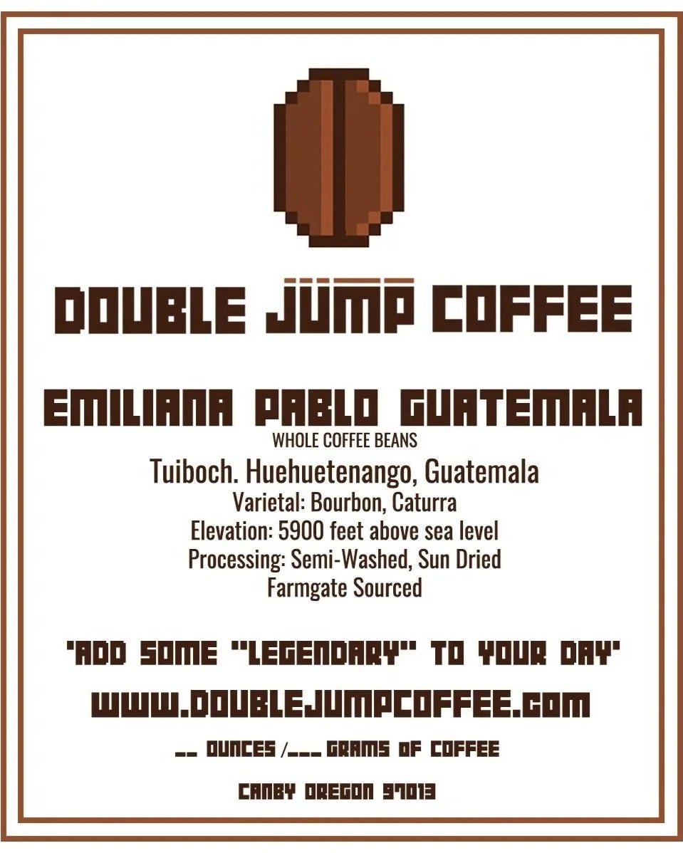 100% Arabica coffee from Huehuetenango, Guatemala. It is a direct trade coffee from a single farmer, Emiliana Pablo. She farms, picks and processes her own coffee crop with help from her local co-op. Roasted to just before second crack, it is a low acidity coffee with a flavor profile of Dark chocolate, Caramel with very faint floral finish. It's a crowd pleaser in every way.